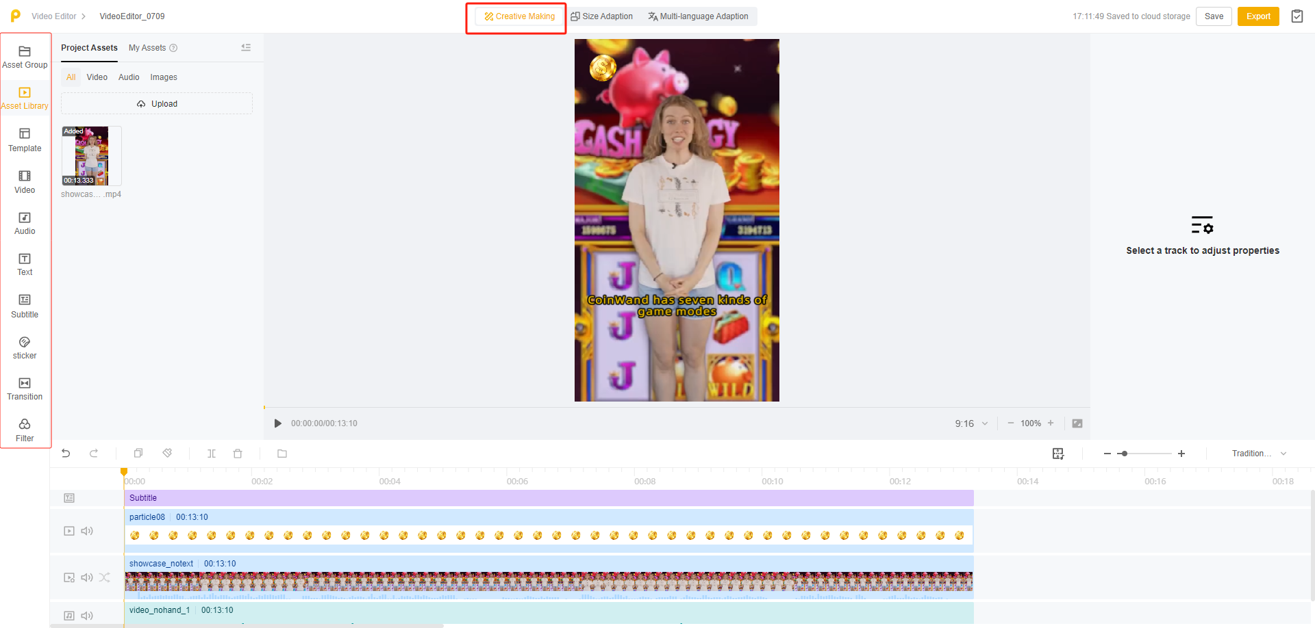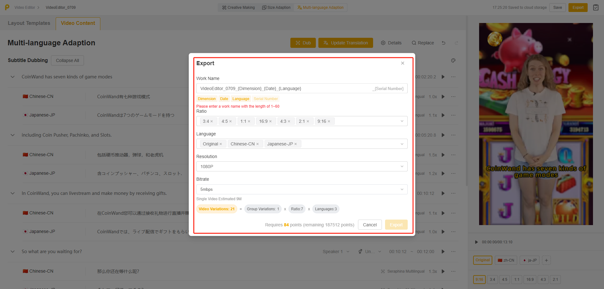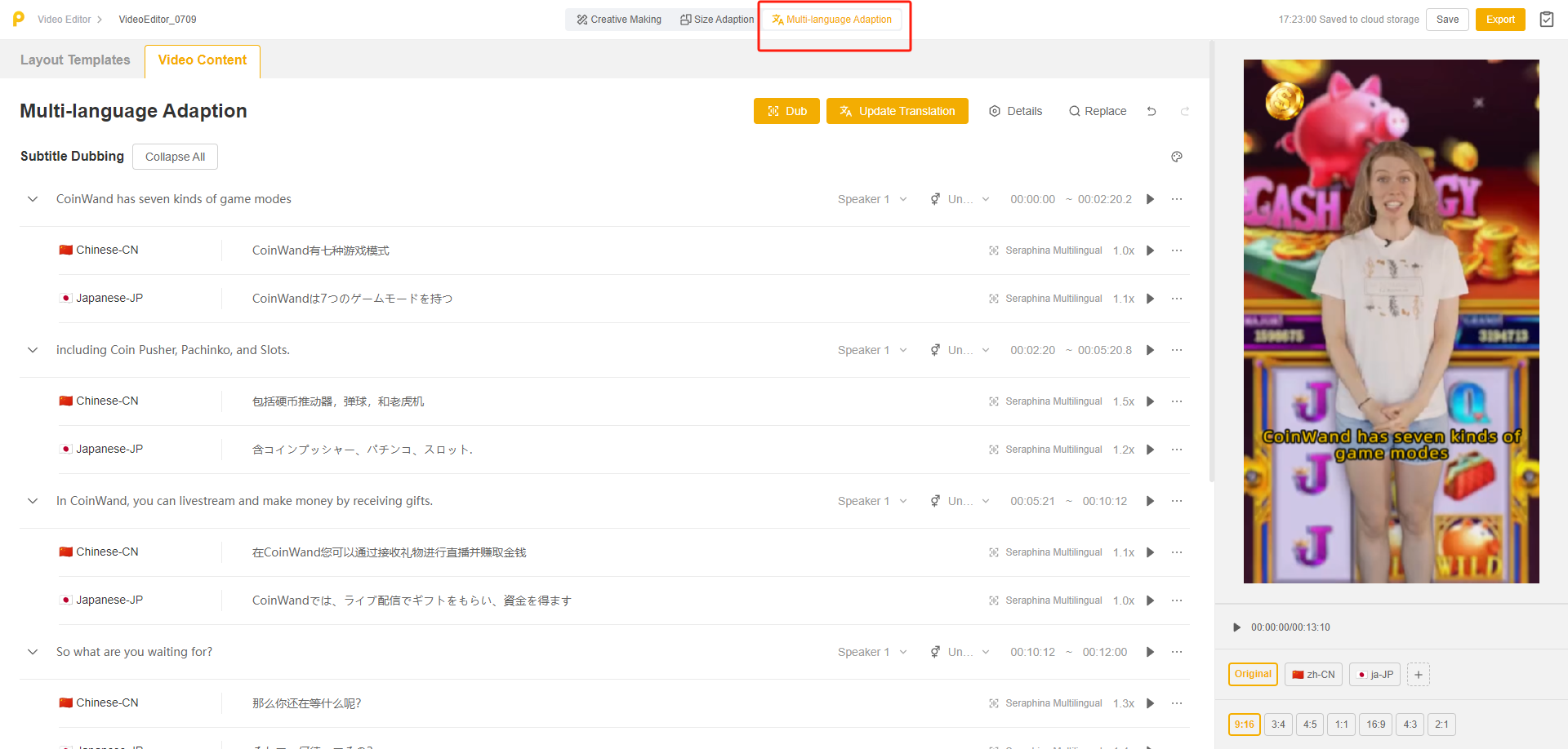 After adjusting the layout for multiple sizes, if you need to use the created video in different countries or regions, switch to the "Multi-language Adaption" editing page to quickly translate the video project and export multiple language versions simultaneously.&#x20;